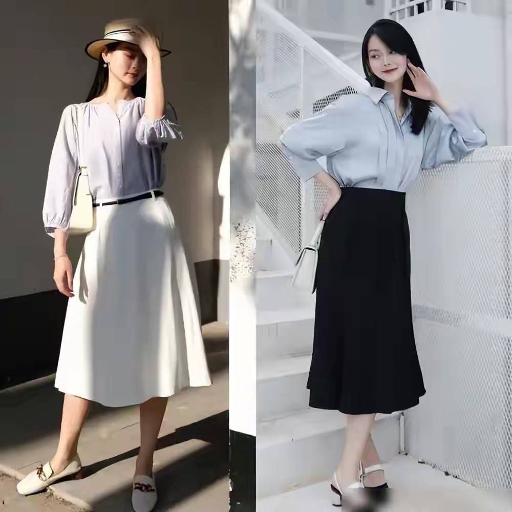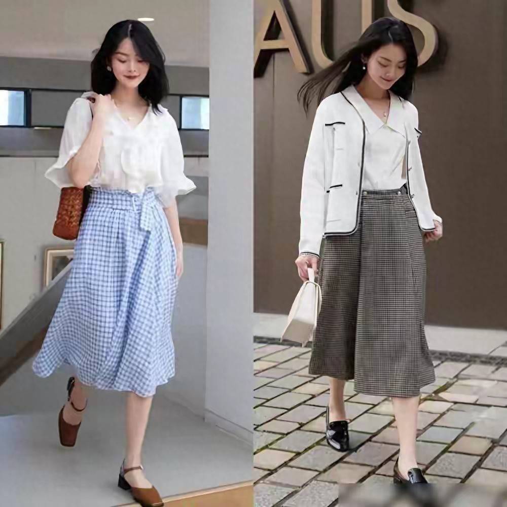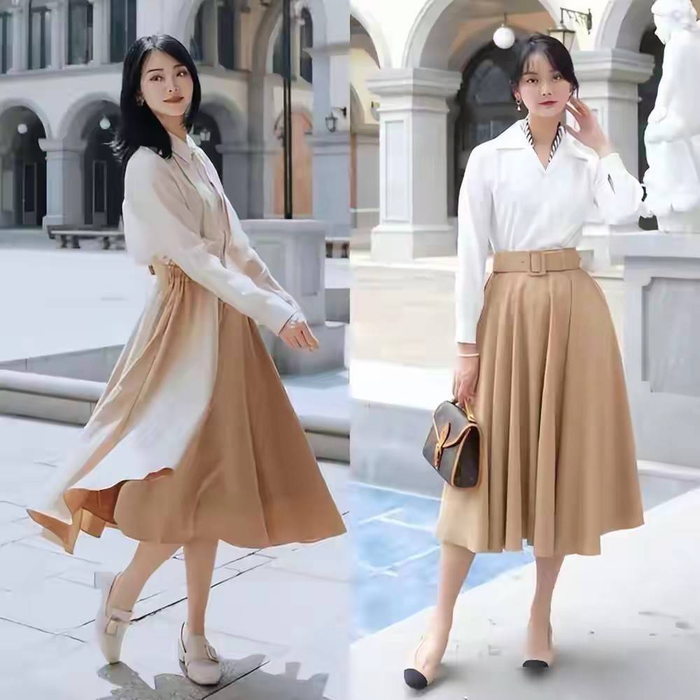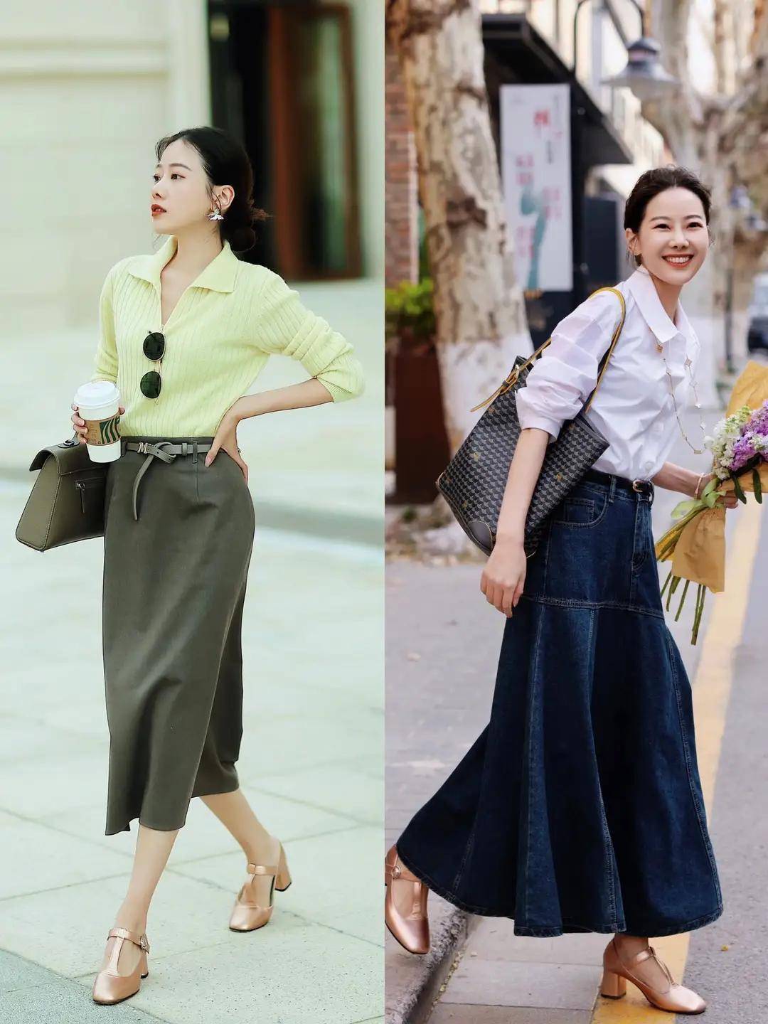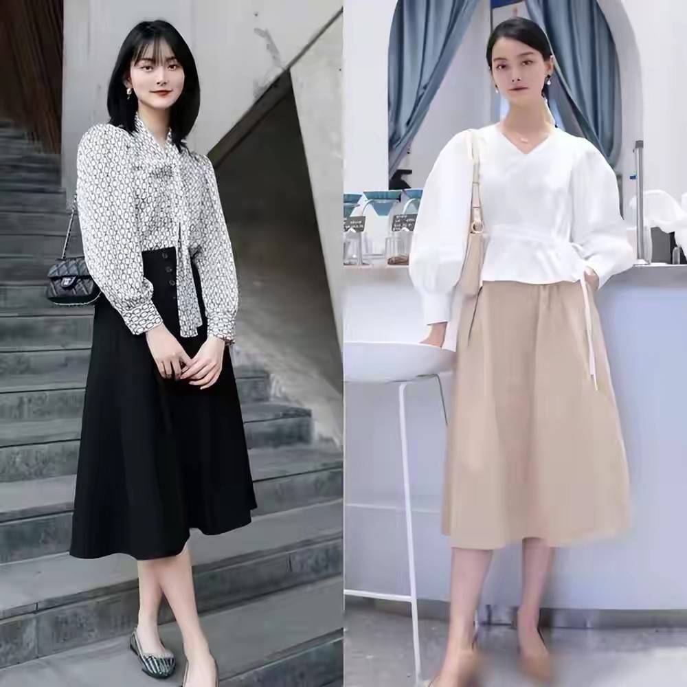 当然了,就算是选择把衬衫的衣角扎进裙子里面,想要更好的展现腰线,你的裙子也是必须选那种高腰收腰款,同时,裙摆是外扩的设计,比如说像伞状半身裙a字半身裙,还有直筒半身裙,这样的裙子对于梨形身材,腿粗胯宽的女性就很友好,能把身上的缺点都遮住。