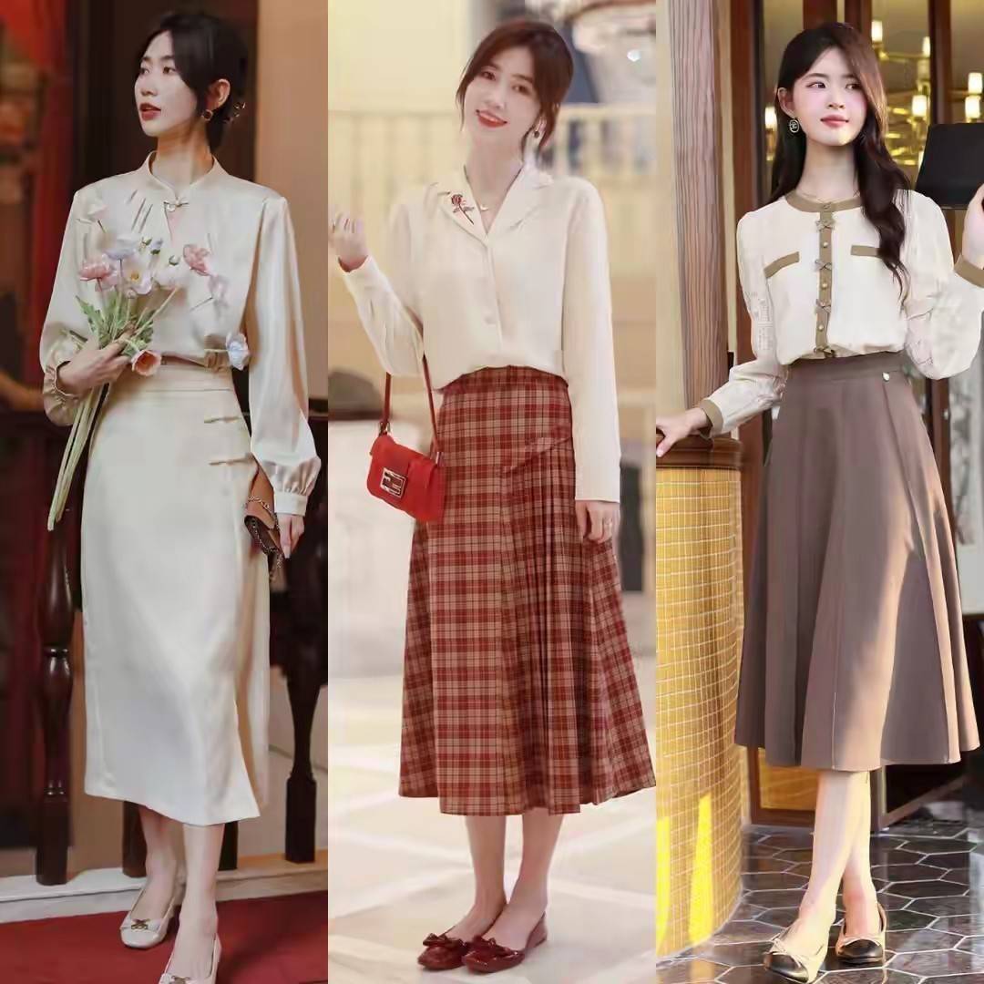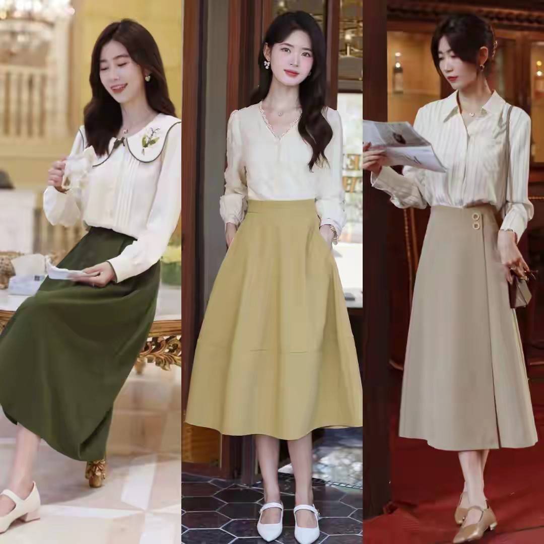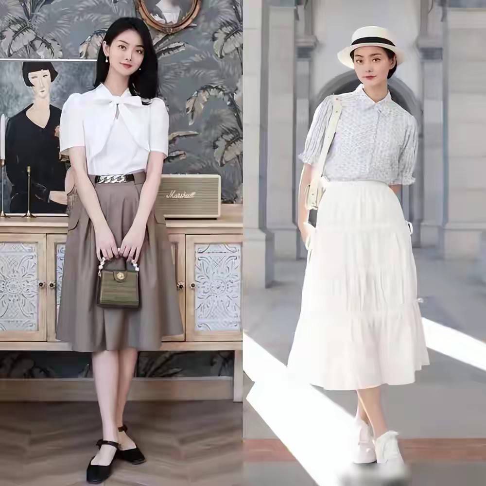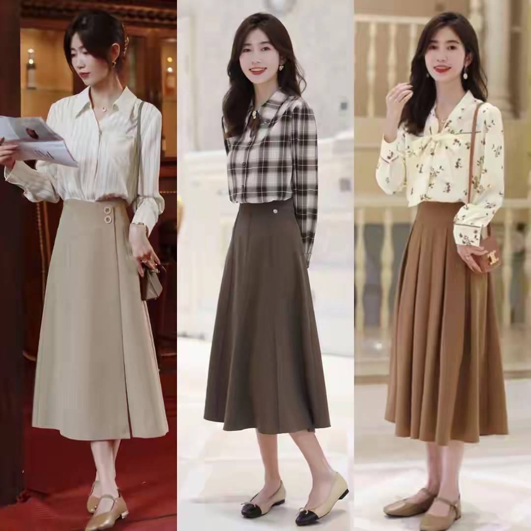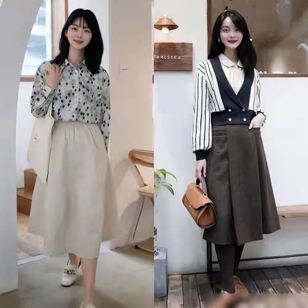 当然了,就算是选择把衬衫的衣角扎进裙子里面,想要更好的展现腰线,你的裙子也是必须选那种高腰收腰款,同时,裙摆是外扩的设计,比如说像伞状半身裙a字半身裙,还有直筒半身裙,这样的裙子对于梨形身材,腿粗胯宽的女性就很友好,能把身上的缺点都遮住。