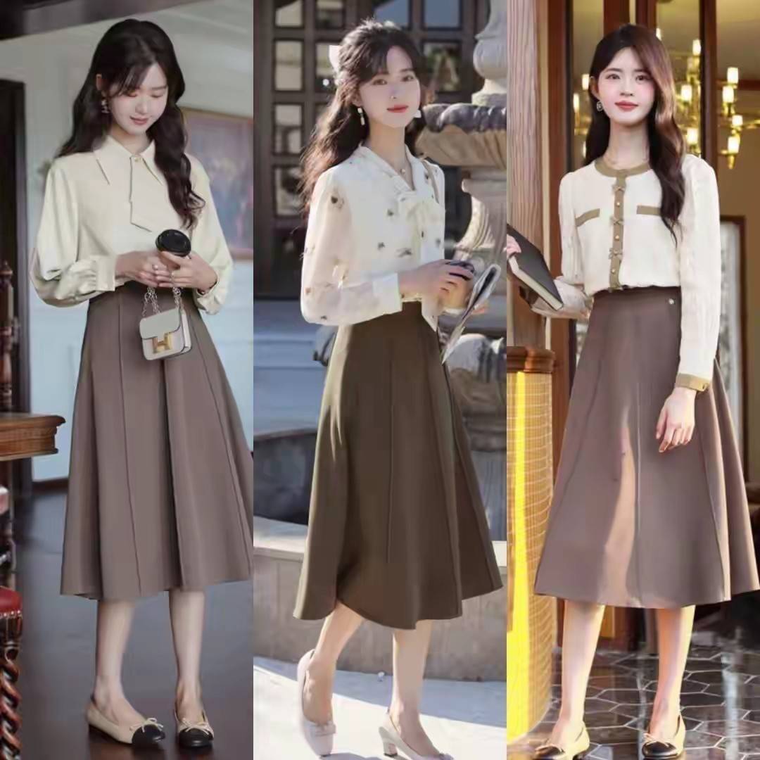 你也可以选择灯笼袖的白色V领衬衫上衣搭配上经典的卡其色半身裙,这一身穿搭更经典耐看,而且修饰肤色能够使得穿搭者变得显白显嫩。