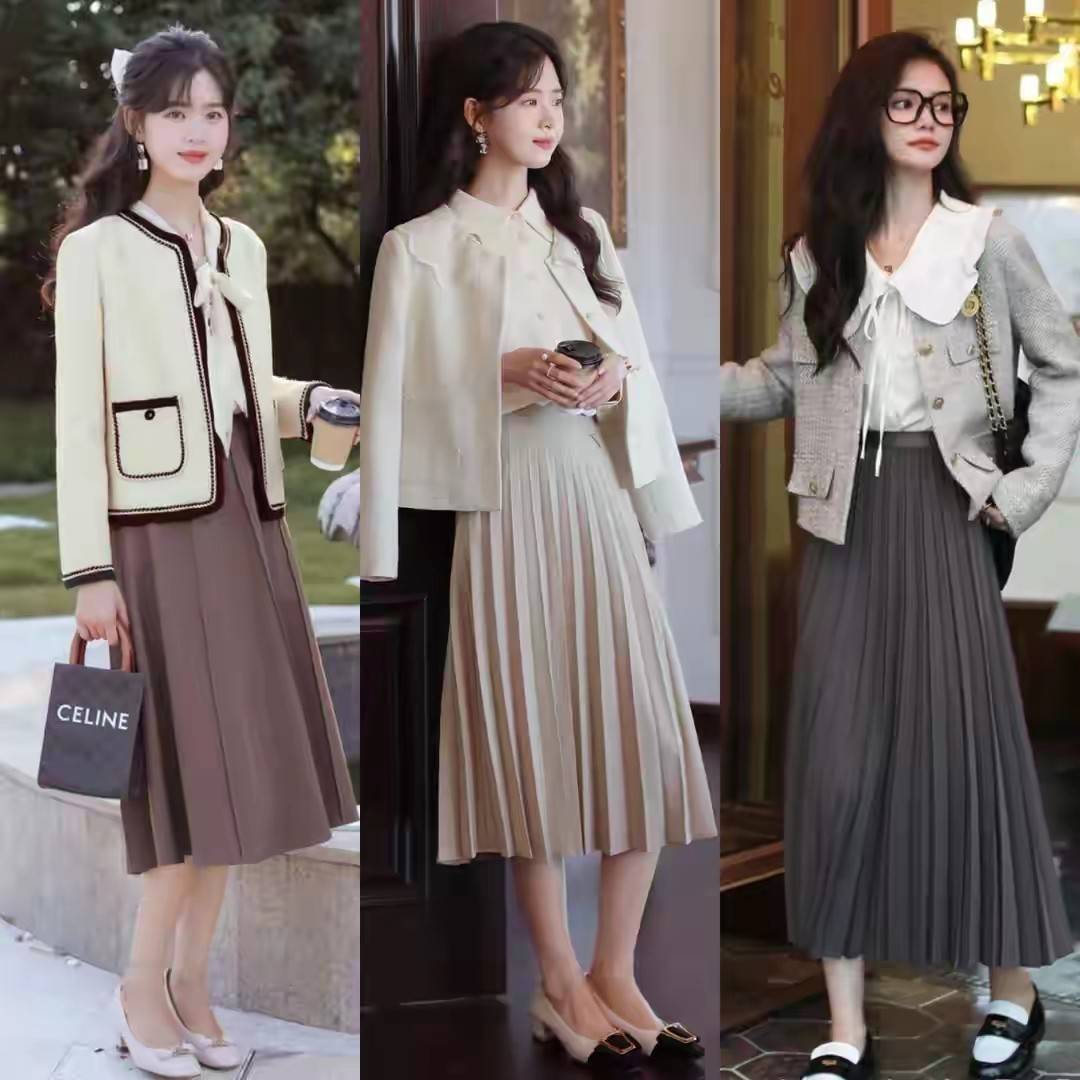 想要斯文的感觉,你还可以加上一款镜框,例如下面右边的这位小个子时尚博主选择了镜框,加上大部分的卷发造型,还有荷叶翻领款式的小众衬衫,加上小香风外套,再加上灰咖色的半身裙,这样的搭配还挺俏皮可爱的。