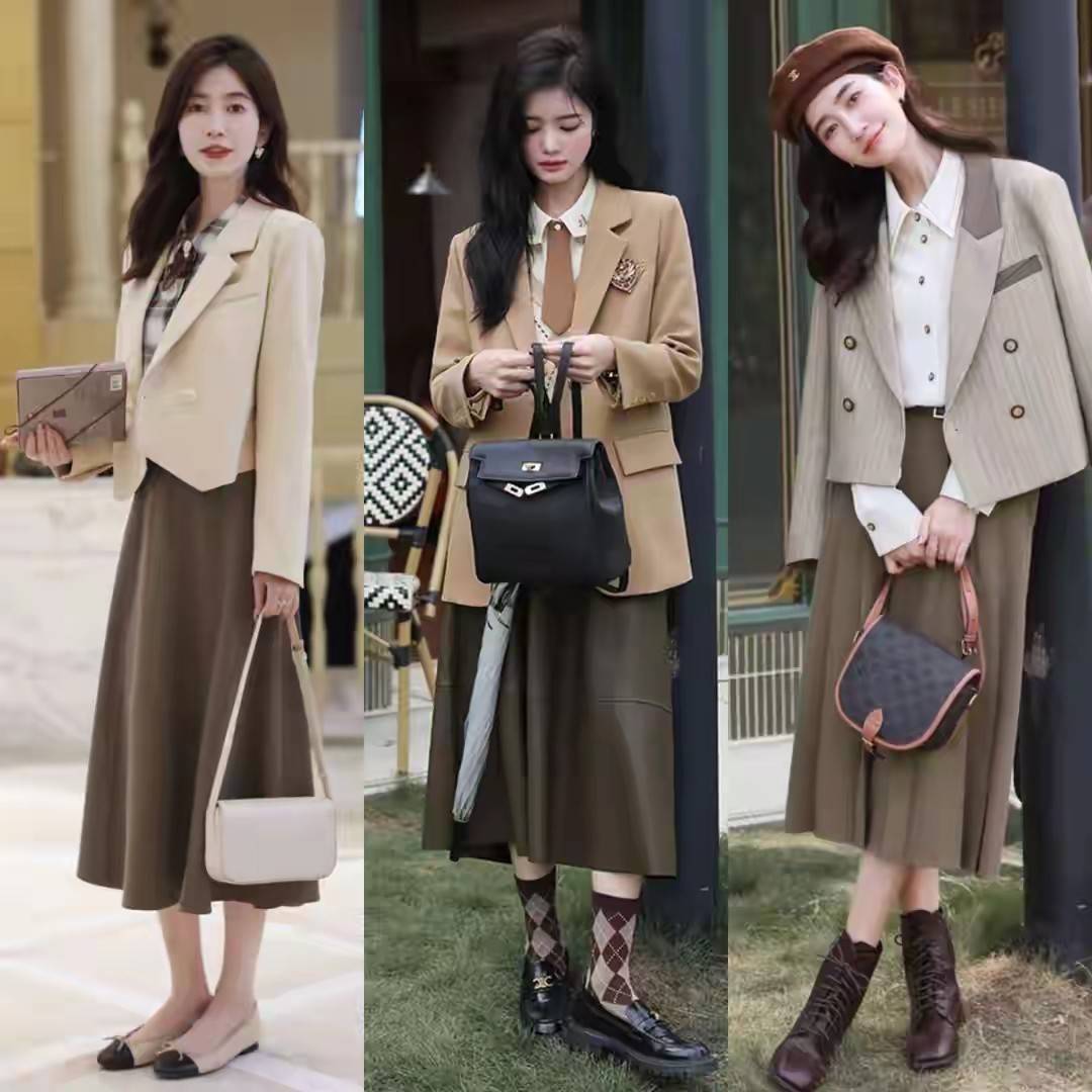 如果你是00后的美少女,出门上班,想让自己的穿衣打扮干练个性一点,可以借鉴下面最右边的这套穿搭,用一款棕色的贝雷帽,搭配上条纹的西服,内搭杏色的衬衫,加上卡其色的半身裙和一双短靴,这样的搭配想不变美都难。