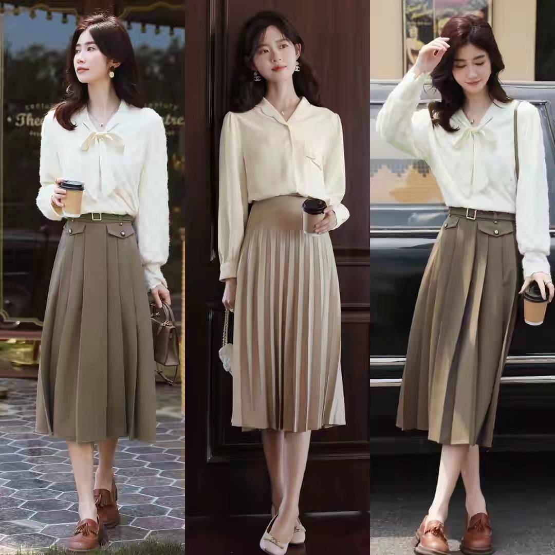 其实女生选择下面这种卡其色或者是杏色的压褶裙,百褶裙非常的百搭耐看,最主要的是很修饰下半身的生产线条感,如果你也像下面这位达人一样,身材偏瘦,这时候你就可以选择这种小众设计的衬衫上衣,搭配上百褶裙和压褶裙,呈现出来的效果,简约又减龄。