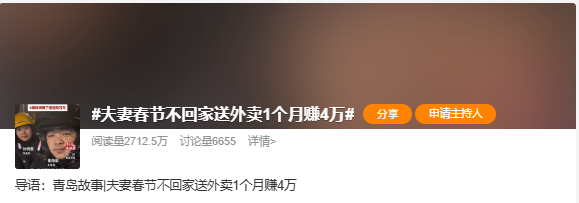 为了还债,2026年春节,他们将俩孩子送回老家,自己选择留在青岛。这也是他俩第一次春节不回老家,他们留下的理由很现实:春节单多、价高,四周时间他们赚了近4万块钱。孙晓慧说,“债,会一笔一笔还清,我俩不会一直送外卖,但会一直陪伴着彼此,跑下去……”
