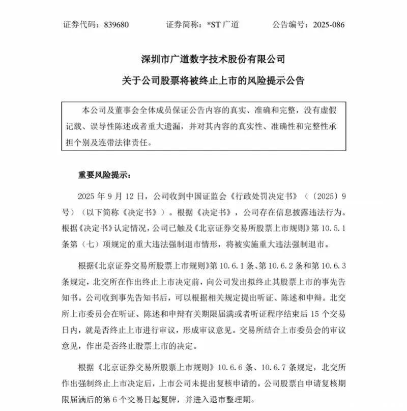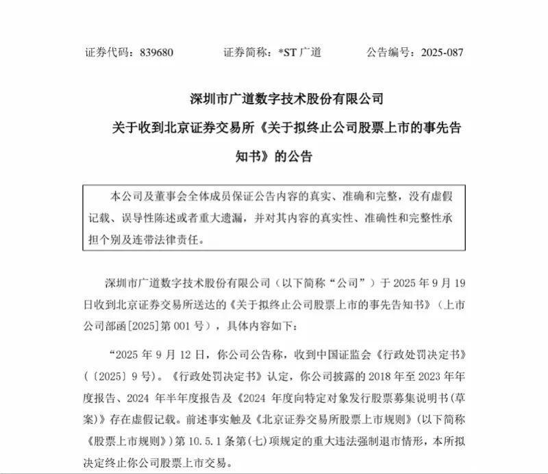 因连续7年财务造假,*ST广道(839680.BJ)或将成为北交所首单因重大违法而被强制退市的上市公司。